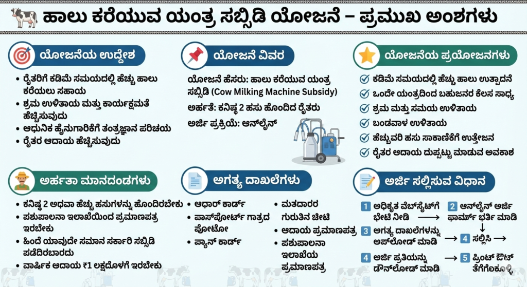 | ಯೋಜನೆ ಹೆಸರು | ಹಾಲು ಕರೆಯುವ ಯಂತ್ರ ಸಬ್ಸಿಡಿ /ಉಚಿತ |